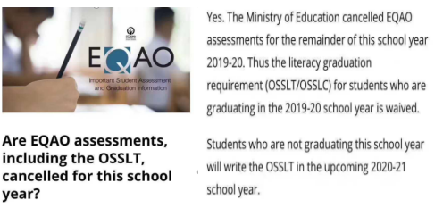 2. 針對12年級在讀的學生,安省教育廳已經(jīng)充分考慮到了疫情的影響,做出了針對畢業(yè)班學生的重大決定-取消今年-2019-2020學年度的“安省中學生英語統(tǒng)考”(OSSLT)。由于該考試及格是安省中學畢業(yè)、報考大學的必要條件,教育廳同時宣布,對于預計今年高中畢業(yè)的學生,OSSLT的畢業(yè)要求將被免除。也就是說,他們集體算為“及格”,只要滿足其他條件,可以正常拿到畢業(yè)證。