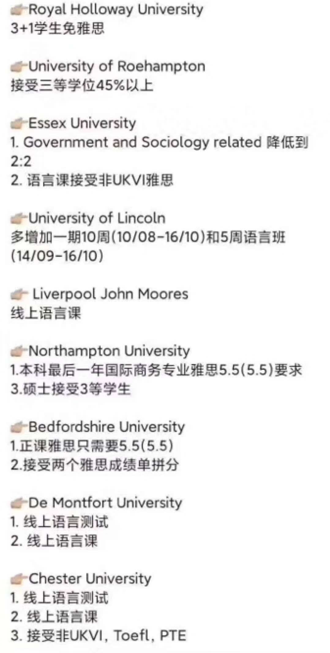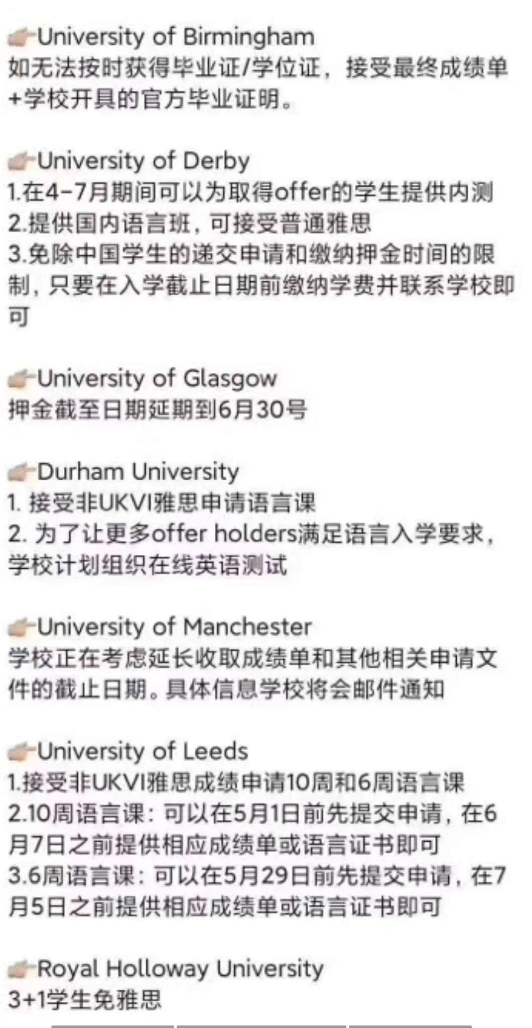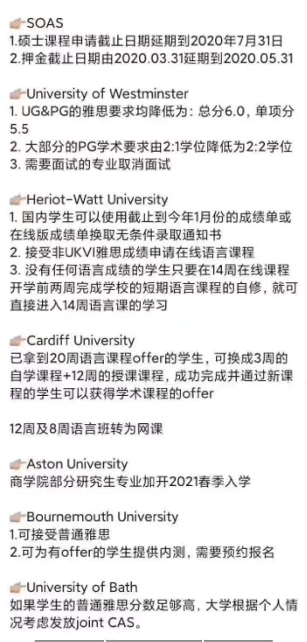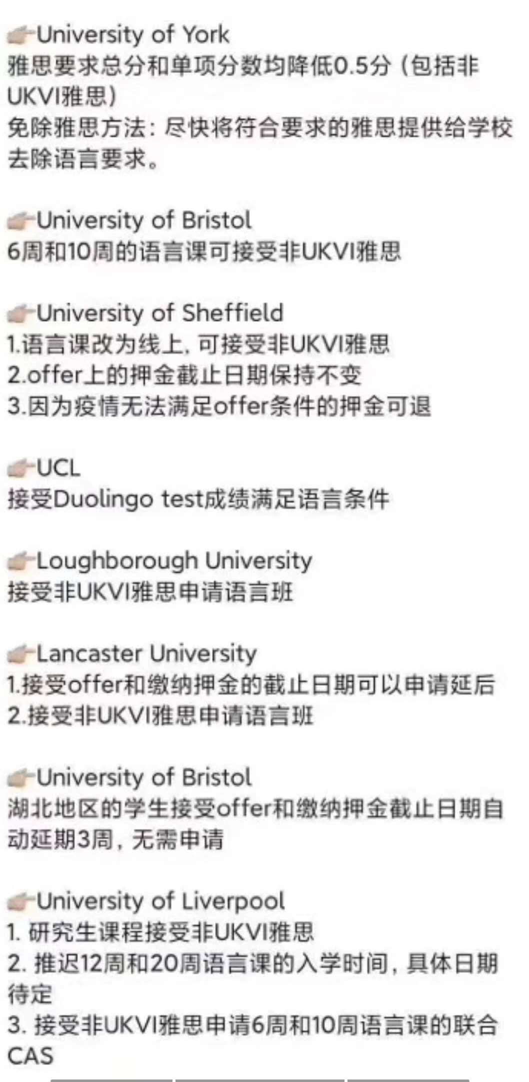 因?yàn)橐咔?,?duì)于今年要出國留學(xué)的學(xué)生也有一定的影響,比如雅思考試3、4、5月份的考試取消,截止目前英國簽證中心依然處于關(guān)閉狀態(tài),雖說有這兩項(xiàng)的影響,但也沒有阻擋想去英國讀書小伙伴的學(xué)習(xí),英國各個(gè)大學(xué)開設(shè)線上授課,語言也開始接受非UKVI雅思甚至是其他語言,還有部分學(xué)校,目前采取線上和之后的實(shí)地授課相結(jié)合的方式。目前轉(zhuǎn)為線上授課的有以下大學(xué)。