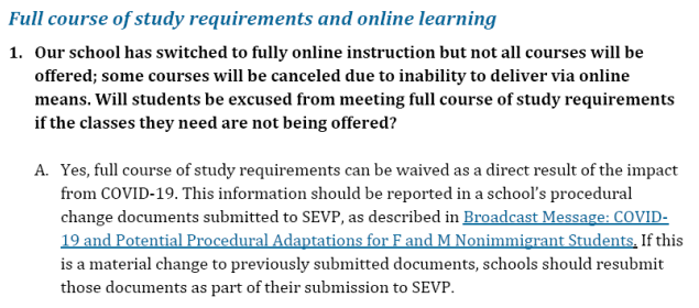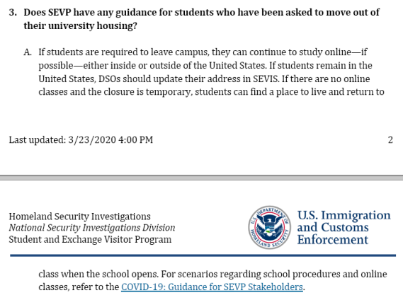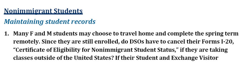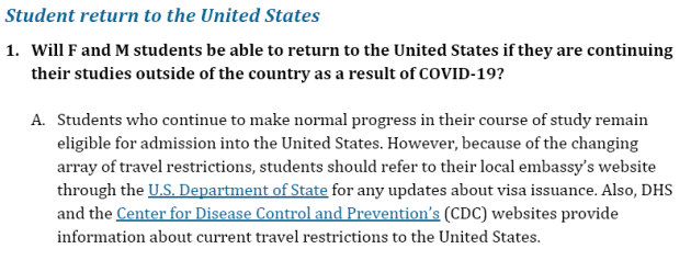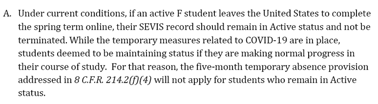 在當前條件下,如果在持F簽證學(xué)生離開美國,以遠程在線形式完成春季學(xué)期,則其SEVIS記錄應(yīng)保持在激活狀態(tài)且不會被終止。如果學(xué)生保持著正常的學(xué)生進度,他們被視為合法學(xué)生身份。因此,五個月的臨時離境限制對SEVIS記錄保持在激活狀態(tài)的學(xué)生不適用。