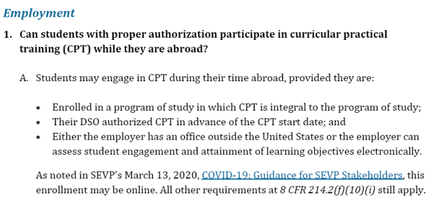 只要國際學(xué)生學(xué)術(shù)項目中包含CPT且DSO提前批準CPT開始日期,國際學(xué)生可以合理在美國境外或線上參加CPT。