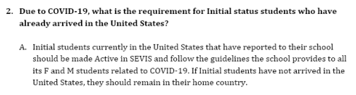 已經(jīng)抵達美國境內(nèi)的新生需要遵守移民局規(guī)定,向?qū)W校報到并更新你的SEVIS信息,學(xué)生可以維持相應(yīng)的學(xué)生身份。對于還沒有到達美國的學(xué)生,建議留在自己的國家。