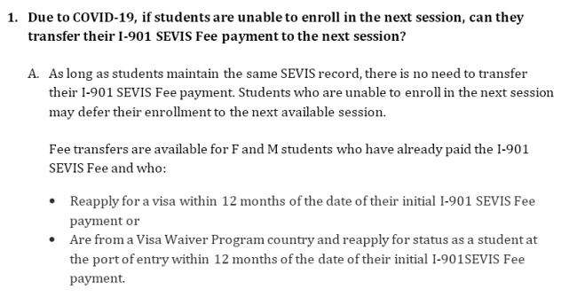 只要學(xué)生保持相同的SEVIS號碼,就無需轉(zhuǎn)移其I-901 SEVIS費用付款。無法注冊下一期課的學(xué)生可以將他們的注冊推遲到下一次開學(xué)。