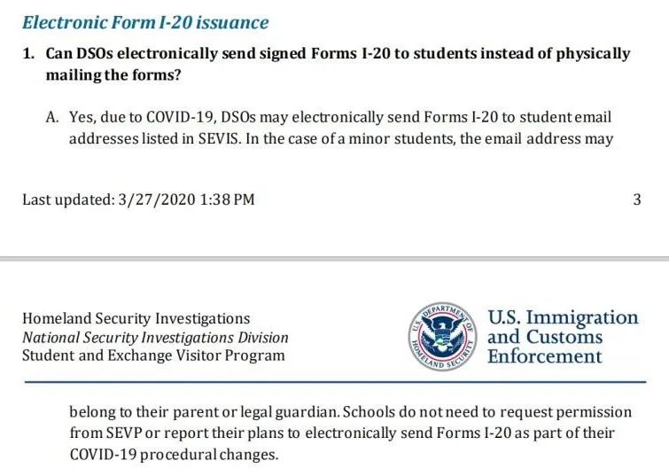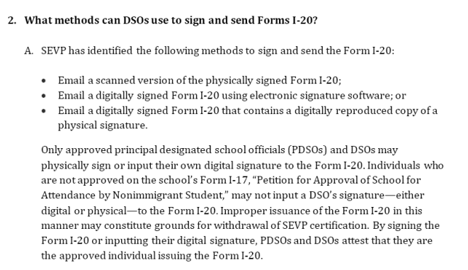 同時,SEVP也給了學(xué)校DSO詳細的指導(dǎo),如何使用以及發(fā)送相應(yīng)的電子版I20。如果同學(xué)們的DSO不知道此事,可以把以下截圖發(fā)給DSO。