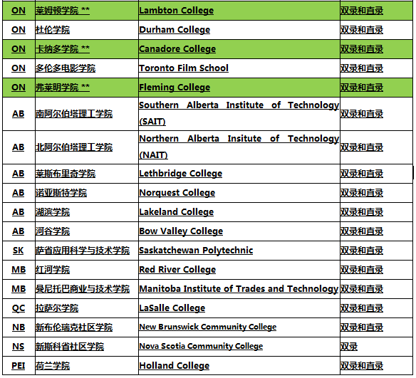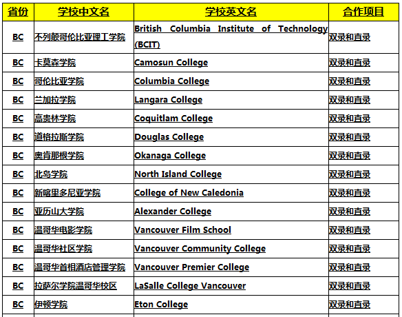 加拿大學(xué)院合作總表:(備注**學(xué)院免申請費活動中)