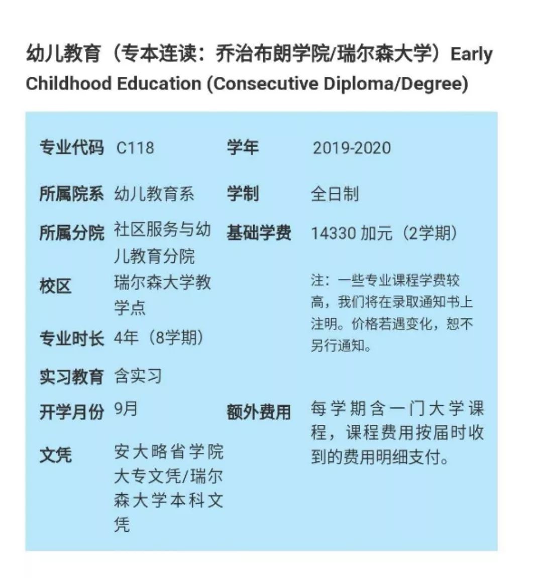 喬治布朗學(xué)院開設(shè)有跟瑞爾森大學(xué)專本連讀的幼兒教育專業(yè),畢業(yè)后學(xué)生可以獲得喬治布朗學(xué)院的幼兒教育大專文憑和瑞爾森大學(xué)的學(xué)士學(xué)位證書。
