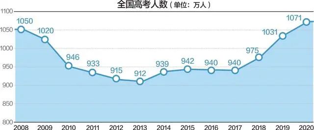 通過下圖可以看到,與2019年的1031萬比,今年報名人數(shù)增加了40萬人。相信接下來隨著二胎的放開,還會呈現(xiàn)增長的趨勢,高考競爭愈加激烈。
