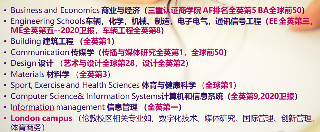 10多個專業(yè)領(lǐng)域全球前200(QS world ):體育,商務(wù)管理,傳媒,藝術(shù)與設(shè)計,機械工程,會計金融,土木與結(jié)構(gòu)工程等。