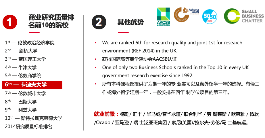 卡迪夫大學(xué)商學(xué)院是獲得AACSB權(quán)威認證的商學(xué)院。依據(jù)REF 2014英國大學(xué)官方排名,其商務(wù)與管理學(xué)科位居全英第六。