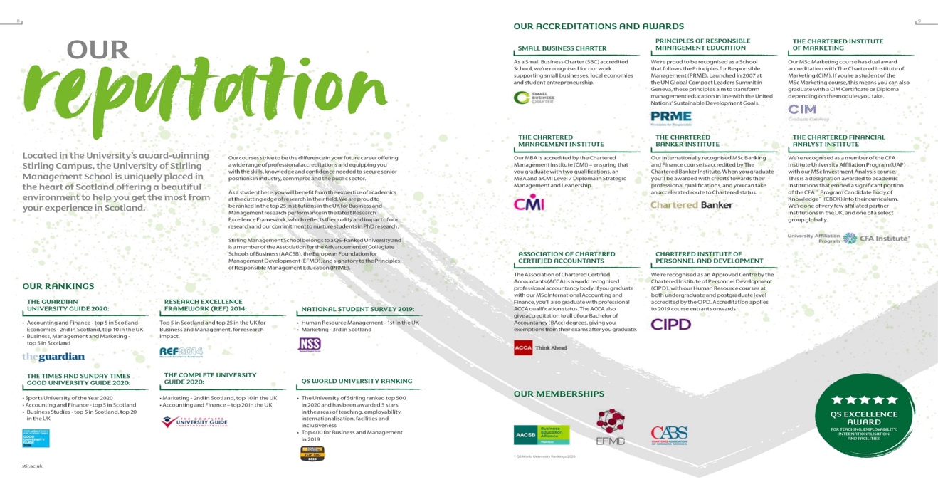 斯特靈大學(xué)管理學(xué)院是一所高質(zhì)量的研究活躍型高等教育機構(gòu),QSS(Quantitative Social Science計量社會科學(xué))研究成果評級非常高。斯特靈大學(xué)在英國《泰晤士報》學(xué)科排名中,商科位居全英前20,并且在上一屆大學(xué)研究活動中,斯特靈大學(xué)在商業(yè)與管理研究影響力方面排名第14位,超越許多羅素集團大學(xué)商學(xué)院。