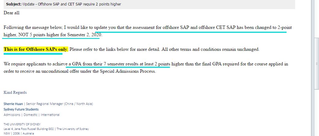 悉尼大學(xué) 針對(duì)offshore學(xué)生的SAP和 CET SAP政策(俗稱conditional coe政策)要求的分?jǐn)?shù)降分啦!之前要求的分?jǐn)?shù)比最低參考錄分?jǐn)?shù)高5分才可以申請(qǐng),現(xiàn)在只需要高2分即可。