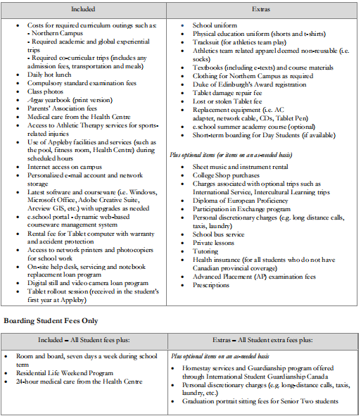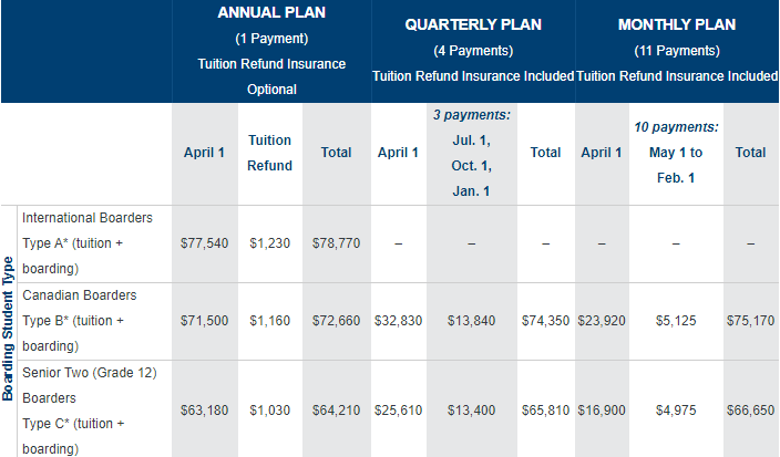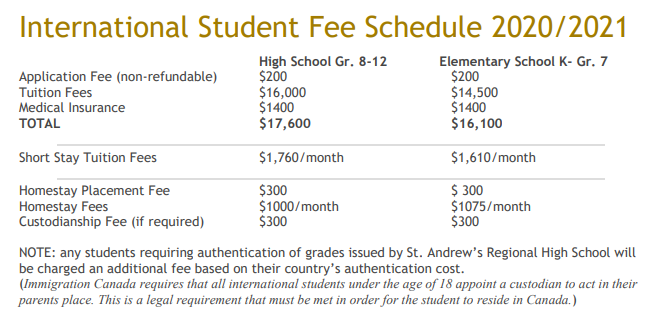 從費(fèi)用上來(lái)講,私貴的費(fèi)用通常都比走讀學(xué)校的費(fèi)用要高,平均費(fèi)用在5萬(wàn)~8萬(wàn)加幣/年左右(包含學(xué)費(fèi),住宿費(fèi)以及餐食費(fèi)),基本上這筆費(fèi)用已包含了學(xué)生在讀期間所需要的支出;本土走讀制學(xué)校的學(xué)費(fèi)平均在1.6萬(wàn)~3萬(wàn)加幣/年左右,不包含住宿費(fèi)以及食宿費(fèi);國(guó)際學(xué)校平均學(xué)費(fèi)在2萬(wàn)~3萬(wàn)加幣/年,如果是有寄宿制的國(guó)際學(xué)校,額外的寄宿費(fèi)用大概是在1.5萬(wàn)~1.7萬(wàn)/年加幣,其中包含了餐食費(fèi)。以下為三種類(lèi)型學(xué)校費(fèi)用舉例說(shuō)明(僅限于2020-2021學(xué)年費(fèi)用):