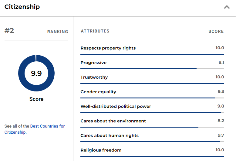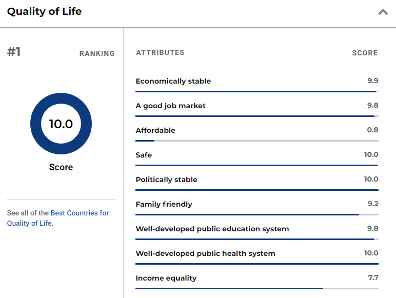 頂尖的空氣質(zhì)量,讓我們能更安心地享受大自然;豐富的食物和淡水儲備,讓我們從不用擔(dān)心“食不果腹”;位于金字塔頂端的教育、育兒、養(yǎng)老質(zhì)量,讓我們明白它是一個值得托付終生的國家。