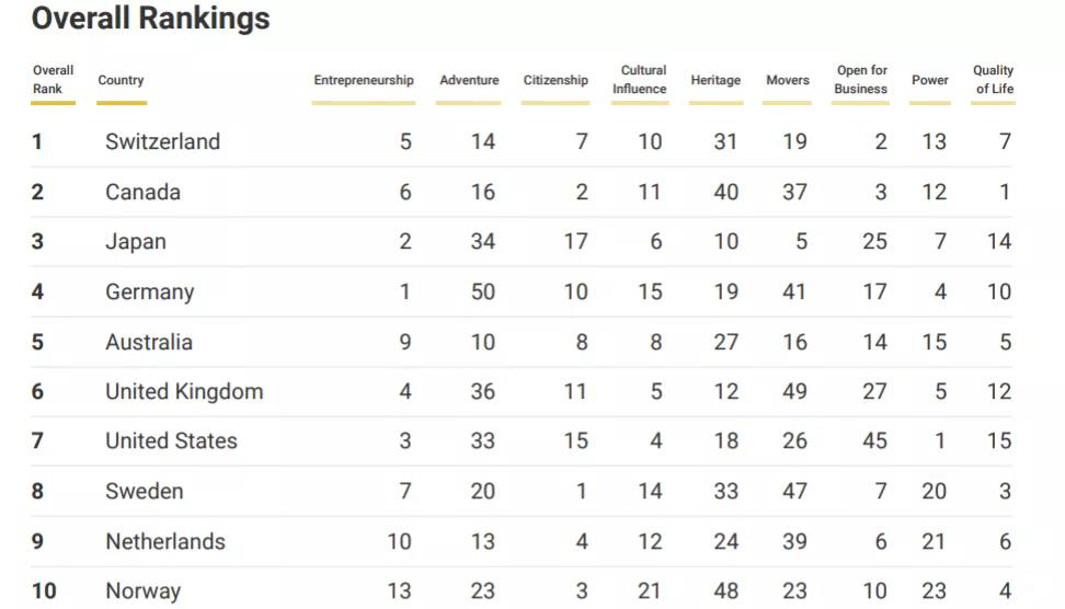 全球最佳國家,加拿大高居第二