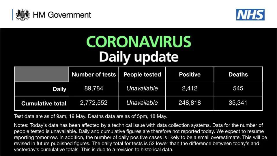 英國5月19日做了89784次檢測,新增2412例,累計確診24萬8818例;新增死亡545例,累計死亡35341例,病死率為14.2%。