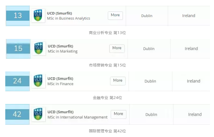 2019年UCD通過(guò)優(yōu)異的成績(jī)?cè)俅纬蔀閻?ài)爾蘭大學(xué)中唯一進(jìn)入榜單前50名的商學(xué)院,同時(shí)也是英國(guó)和愛(ài)爾蘭僅有的10所進(jìn)入前25名的大學(xué)之一,其中包括倫敦商學(xué)院(London business School)、劍橋大學(xué)(Cambridge)和牛津大學(xué)(Oxford)。