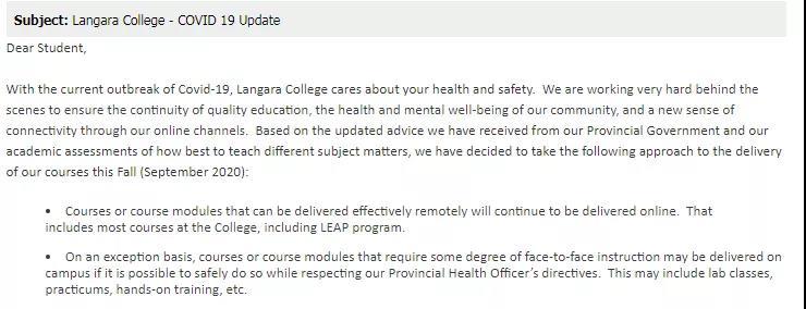課程安排會(huì)以郵件形式發(fā)送給學(xué)生的郵箱,未來(lái)幾周內(nèi)學(xué)生的郵箱會(huì)收到剩余學(xué)費(fèi)繳費(fèi)通知,請(qǐng)?zhí)嵝褜W(xué)生注意查收。上網(wǎng)課需要持有有效學(xué)簽;如果學(xué)生入境加拿大,還需要隔離14天。