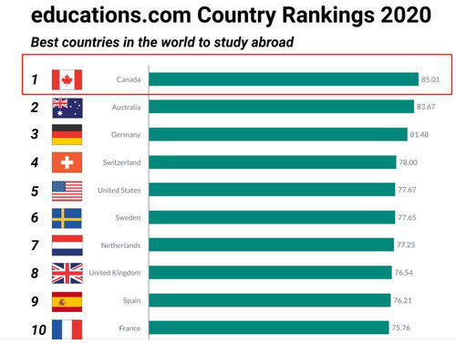2020年全球教育網(wǎng)公布的各國教育排名中,加拿大雄踞榜首,澳大利亞位居第二位,德國排名第三,而美國和英國分別位居第五位和第八位。這份排名是根據(jù)7項(xiàng)因素對30,000多名國際留學(xué)生進(jìn)行調(diào)查,最后綜合打分得出。