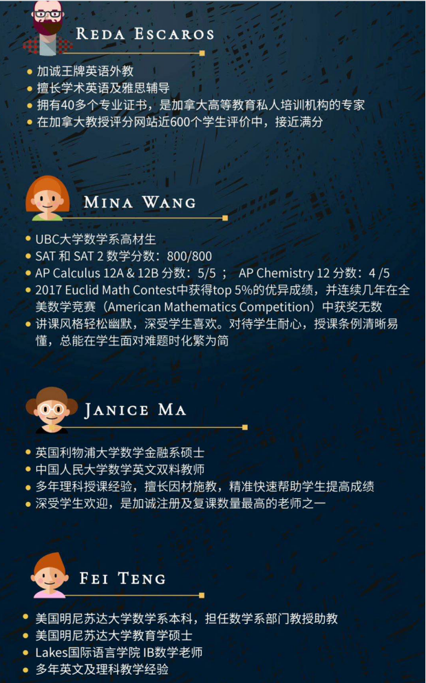 對于大多數(shù)留學(xué)生來說,來到加拿大學(xué)校就讀后,數(shù)學(xué)和科學(xué)課(包括物理、化學(xué)、生物)依舊是主科課程,依據(jù)大學(xué)各個(gè)專業(yè)的招生錄取要求來進(jìn)行倒推式選課,大學(xué)專業(yè)的理科、商科和工程類招生都會(huì)要求高中數(shù)學(xué)成績,其中理科和工程類專業(yè)還會(huì)對物理、化學(xué)和生物三門理科課程有各自的要求,因此9-10年級打好基礎(chǔ),11-12年級拿到高分,就成為沖刺名校的必備條件。我們的教輔項(xiàng)目提供數(shù)學(xué)和理科同步周課輔導(dǎo)以及期中期末的考前復(fù)習(xí)課程,讓本地的名校學(xué)霸和熟悉教學(xué)大綱的老師們助力你的平時(shí)成績和考試分?jǐn)?shù)。