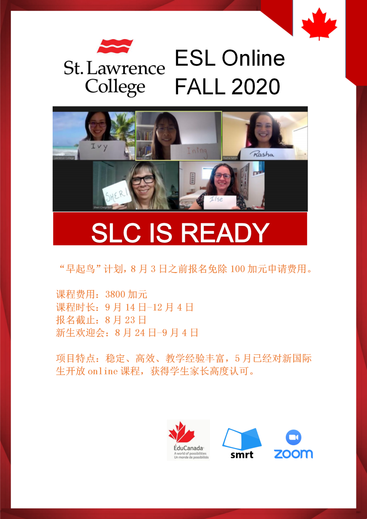 圣勞倫斯學(xué)院是一所位于安大略省金斯頓市的公立學(xué)院,學(xué)歷可做認證,比鄰皇后大學(xué)。中國學(xué)生不足百名,特色專業(yè)包含游戲設(shè)計,商業(yè)數(shù)據(jù)分析,康復(fù)治療師,儀器儀表工程,音樂數(shù)字媒體等。最近圣勞倫斯學(xué)院推出超高質(zhì)量的2020.9 Online ESL課程“早起鳥”計劃,無需學(xué)簽,8月3日之前申請還免100加幣申請費!