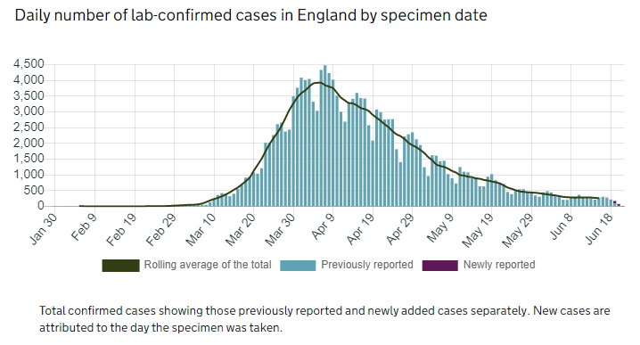 今年,對于全球來講,都是不容易的一年。疫情的消除不是短時間可以達(dá)成的,但是英國疫情如今控制的不錯。在四月份疫情高峰期過后,每天確診人數(shù)逐日遞減。一份來自GOV.UK的英格蘭每日確診人數(shù)數(shù)據(jù)圖如下:
