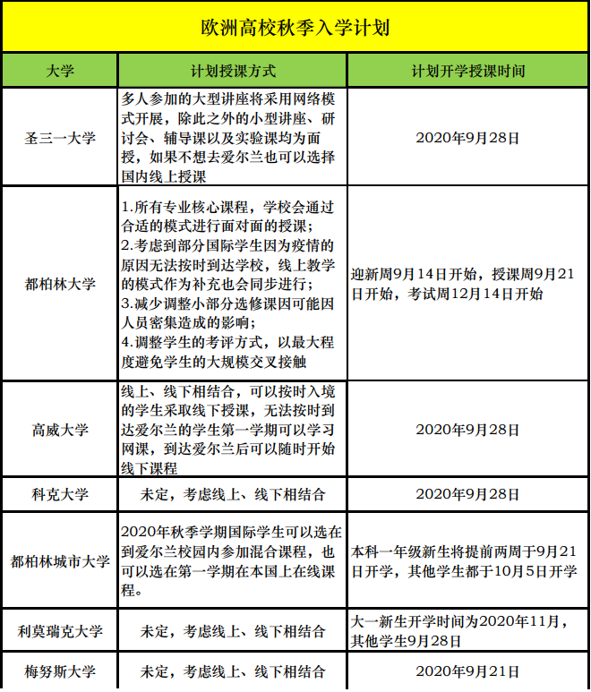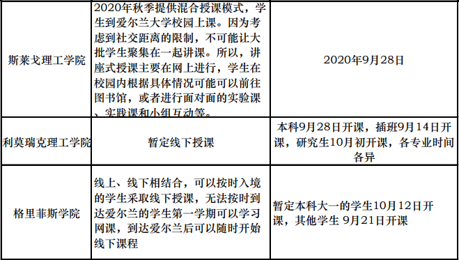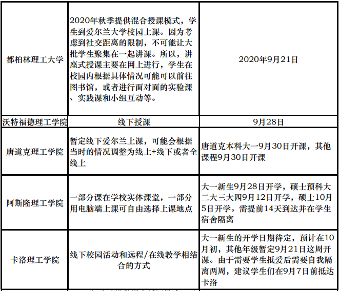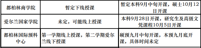經(jīng)過(guò)愛(ài)爾蘭政府嚴(yán)格有效的管控和人民共同的努力,愛(ài)爾蘭的疫情得到最有效的控制。愛(ài)爾蘭政府于2020年5月18日啟動(dòng)階段性恢復(fù)社會(huì)生產(chǎn)生活的規(guī)劃,也就是大家俗稱的“五步重開(kāi)路線圖”。按照規(guī)劃,愛(ài)爾蘭全國(guó)將于8月中在遵循世衛(wèi)組織與愛(ài)爾蘭衛(wèi)生部的個(gè)人安全防護(hù)指導(dǎo)下,全面恢復(fù)正常的生產(chǎn)生活。各大學(xué)近期也在陸續(xù)公布今年秋季開(kāi)課計(jì)劃,具體時(shí)間及授課方式請(qǐng)見(jiàn)下表。