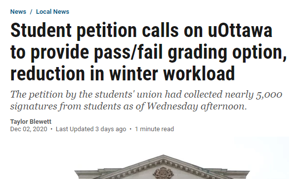 渥太華學(xué)生會(huì)表示,很顯然今年的教學(xué)質(zhì)量下降,但是工作量卻大大增加,這些挑戰(zhàn)加上疫情帶來(lái)的困境,使絕大多數(shù)學(xué)生都無(wú)法適應(yīng)網(wǎng)課學(xué)習(xí)。截止目前,渥太華大學(xué)的學(xué)生會(huì)已經(jīng)收集到超過(guò)5000名學(xué)生的簽名。