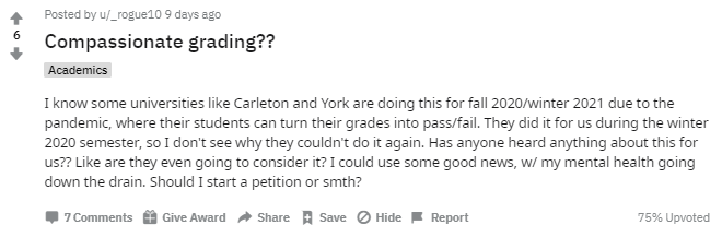 今年的疫情+網(wǎng)課,真是一言難盡! 近日加拿大多所大學(xué)都發(fā)起請(qǐng)?jiān)?,要求學(xué)校給大家留一條“活路”!在本學(xué)期最終的成績(jī)上,提供pass/fail的選項(xiàng),或者satisfactory/Unsatisfactory不顯示具體分?jǐn)?shù)不計(jì)入GPA。
