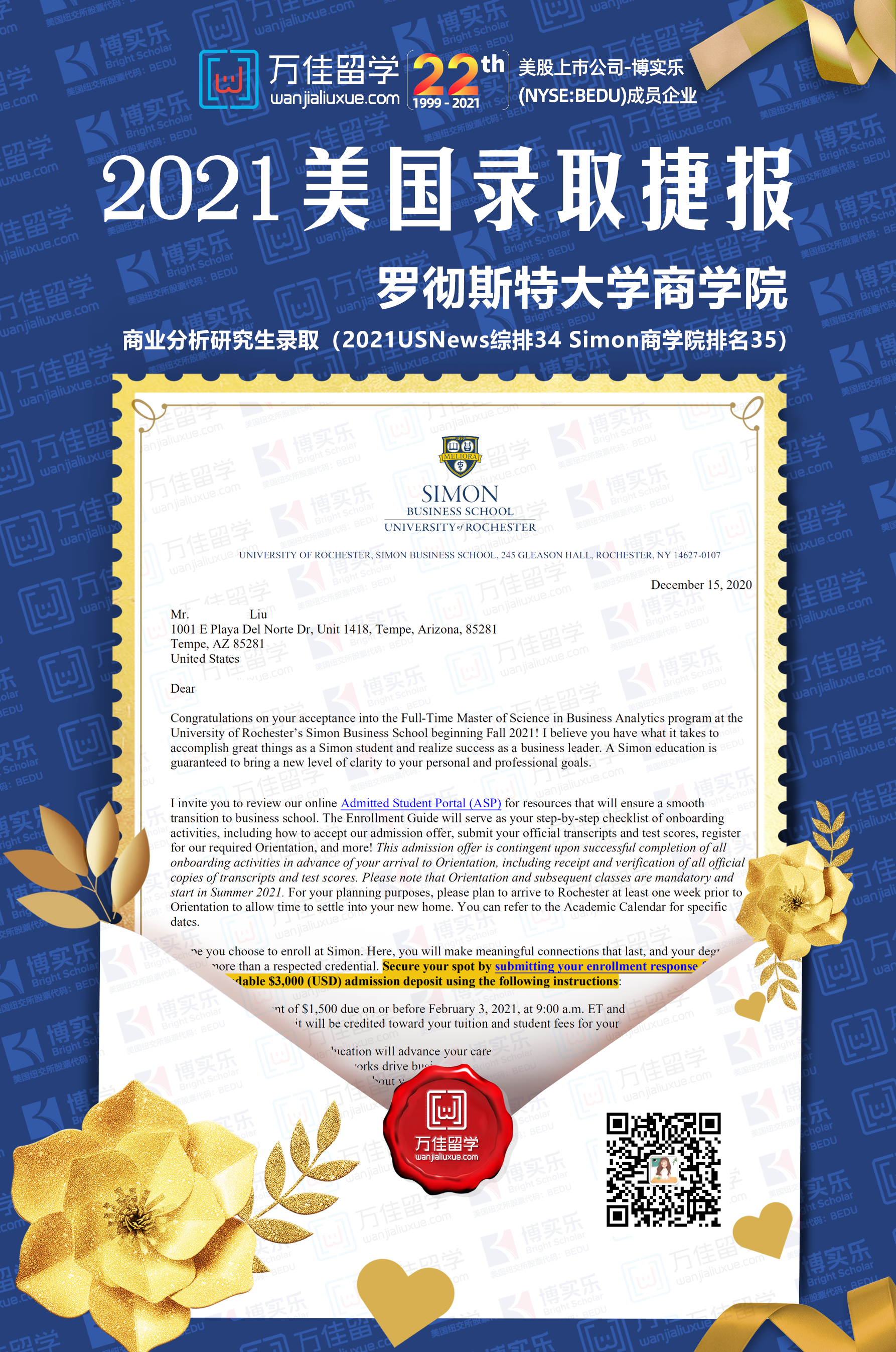 ?? 錄取:美國羅徹斯特大學(xué)西蒙商學(xué)院 Simon Graduate School of business at the University of Rochester