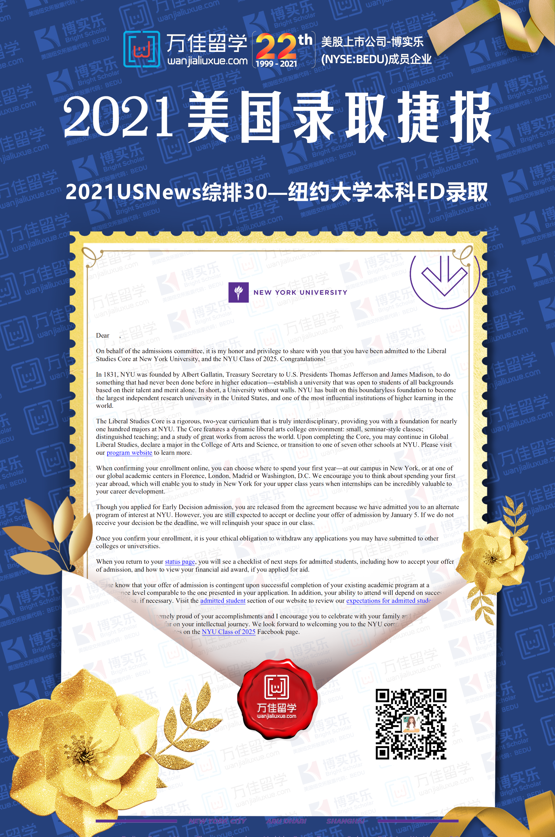 ?? 錄取:美國紐約大學(xué)本科ED錄取 New York University
