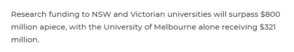 教育部長Dan Tehan表示,這筆補(bǔ)助將為超過40000名研究生和博士提供幫助。其中,新州和維州的大學(xué)獲得補(bǔ)助金額最多,兩個州各獲得大約8億澳元的補(bǔ)助。其次昆州的大學(xué),總計(jì)獲得約5億澳元的補(bǔ)助。而所有大學(xué)中,墨爾本大學(xué)獲得補(bǔ)助金額是最多的,高達(dá)3.21億澳元。