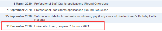 新南威爾士大學(xué)將于2020年12月18日星期五下午5時起關(guān)閉,并將于2021年1月4日星期一重新開放,以應(yīng)對假期。在此期間,主要服務(wù)可能會關(guān)閉或減少時間。
