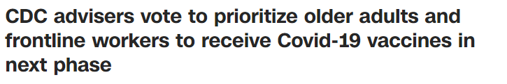 CDC咨詢小組建議,一線重要工作人員和年長的美國人應該排在下階段接種Covid-19疫苗,專家組以13票對1票,通過了此項建議。也就是說,下一輪共有4900萬人有資格打上疫苗,即1B期。