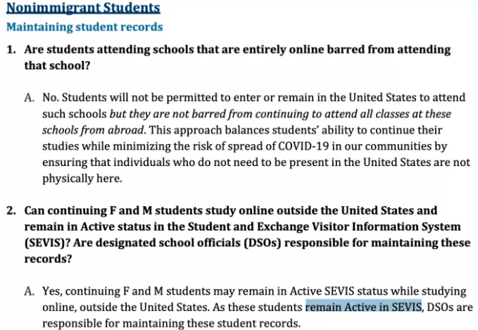 (3)沒有回美國(guó)返校,但仍上網(wǎng)課的學(xué)生,學(xué)生身份仍然有效,只需要在SEVIS中保持激活狀態(tài)。