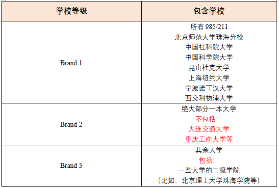 蘭卡斯特大學(xué)今年認(rèn)可院校分為3個等級,不同學(xué)校等級對應(yīng)的學(xué)校有: