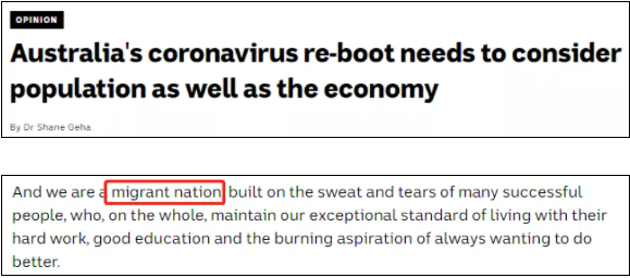 就連ABC也發(fā)文表示,澳洲若想從疫情中恢復(fù),就必須考慮人口以及經(jīng)濟(jì)。文中強(qiáng)調(diào)澳洲是一個(gè)移民國家: