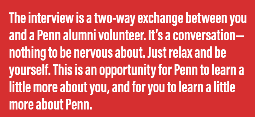 賓夕法尼亞大學(xué)(UPenn)解釋說(shuō):“面試是您和賓夕法尼亞州校友之間的雙向交流。這是一次對(duì)話——不用擔(dān)心,放松,做自己。這為Penn提供了一個(gè)更多了解您的機(jī)會(huì),也為您提供了有關(guān)Penn的更多知識(shí)的機(jī)會(huì)。面試是一個(gè)機(jī)會(huì),您可以作為候選人更好地了解您,也可以讓您更好地了解學(xué)校。”