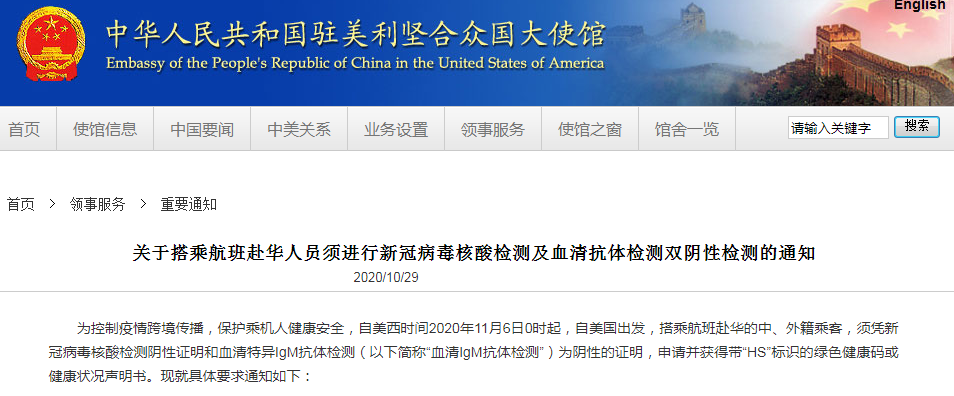 此前從11月6日起,中國(guó)駐美大使館對(duì)美國(guó)出發(fā)回國(guó)人員的檢測(cè)要求進(jìn)行了更新,