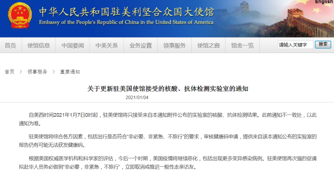 近日中領(lǐng)館再次官宣:自美西時(shí)間2021年1月7日0時(shí)起,駐美使館將只接受來自通知附件公布的實(shí)驗(yàn)室的核酸、抗體檢測(cè)結(jié)果!