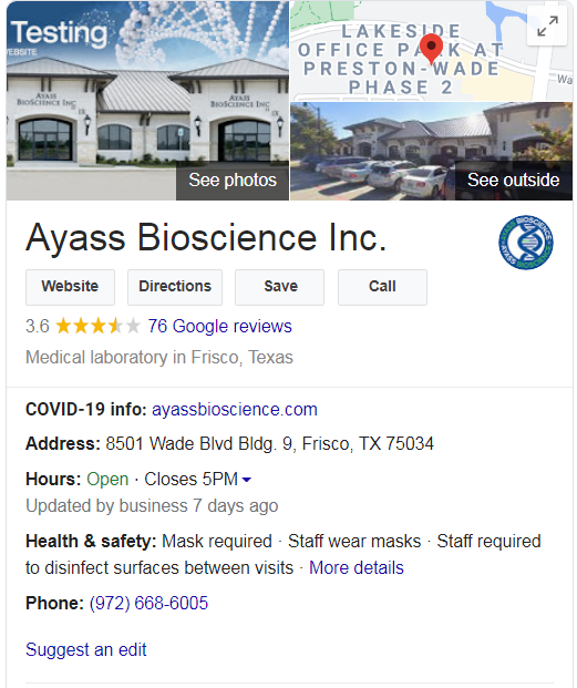 據(jù)悉,該實(shí)驗(yàn)室位于華人新興區(qū)的Frisco地址:8501 Wade Blvd. Bldg 9 Frisco, TX 75034電話:(972)668-6005網(wǎng)站:https://ayassbioscience.com