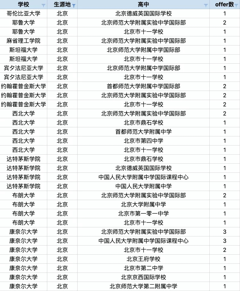 北京的國際學(xué)校和國際部共收獲了42枚offer,前三甲為: