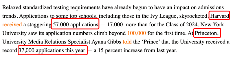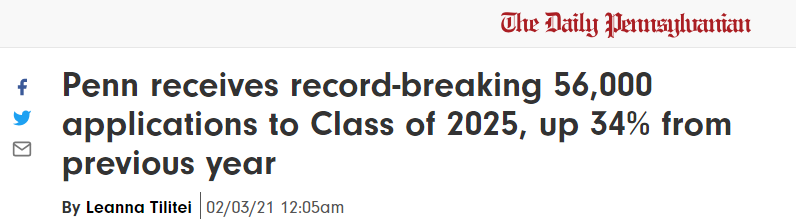 賓夕法尼亞大學也宣布:Class of 2025申請人數(shù)破紀錄,比上一年增長了34%!據(jù)賓大招生辦透漏,今年秋季入學申請共56,000份,但學校不打算擴招,將直接導致賓大錄取率會直線降低