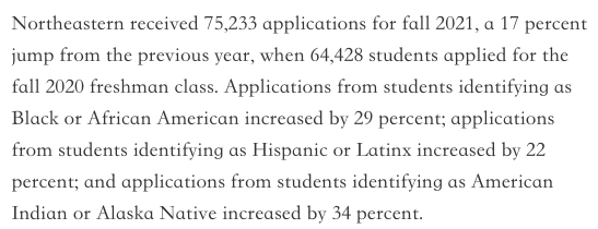 而國際生最喜愛的大學之一——東北大學,2021-22學年共收到了超過75, 000份本科申請,比去年增加了17%,創(chuàng)下了歷史新高。招生官表示:“其中國際生申請人數(shù)增長了6%,上升趨勢較為溫和,這可能是過去幾個月美國對簽證限制的結果。”