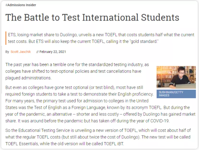 多年來,托福考試是作為英語考試的“首選”,但在新冠疫情期間,一種更短、更便宜的多鄰國考試成為檢測英語水平的“黑馬”,動搖了托??荚嚨牡匚?。ETS隨即推出了TOEFL Essentials考試來對標多鄰國考試。