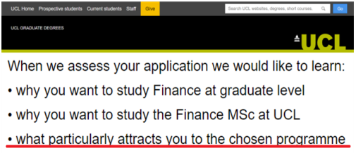 就比如UCL的MSc Finance專業(yè),希望在學生的文書中看到該專業(yè)對其產生吸引力的因素。