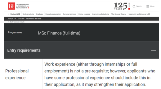 就比如LSE的“MSc Finance”專業(yè)就標明,工作經驗雖然不是考量申請的先決條件,但能夠增加申請人的優(yōu)勢,建議學生在材料中包含這部分內容。