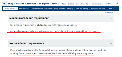 帝國理工學院的熱門專業(yè)申請(比如下方的MSc Finance專業(yè)),就要求學生提供詳盡的職業(yè)規(guī)劃,這部分也是學校在成績之外的考量重點。