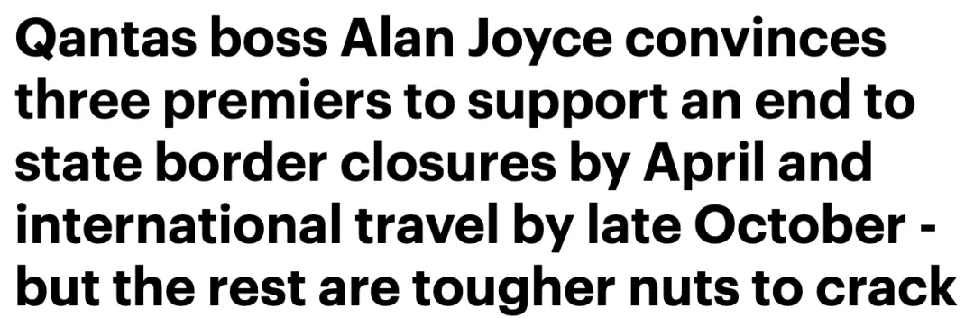 目前澳航公司老板已經(jīng)說服了三位州長(zhǎng),支持他下個(gè)月結(jié)束州境封鎖甚至是國(guó)境解封的請(qǐng)求。