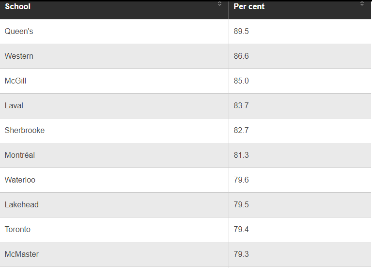 在上述榜單中,備受留學(xué)生關(guān)注的三所大學(xué):多倫多大學(xué)(University of Toronto),英屬哥倫比亞大學(xué)(University of British Columbia)和滑鐵盧大學(xué)(University of Waterloo),就畢業(yè)率來看,其實(shí)都不算高,分別為79.4%,76.4%和79.6%。也就是說,這三所學(xué)校每年都幾乎有近20%的學(xué)生無法順利畢業(yè)。加拿大名校