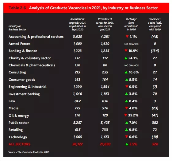 英國主要雇主對(duì)畢業(yè)生招聘的最新評(píng)估顯示2021年提供的畢業(yè)生職位空缺數(shù)量仍將有2.5%的小幅上升,自2021招聘周期開始以來,9個(gè)關(guān)鍵行業(yè)和商業(yè)部門的畢業(yè)生招聘目標(biāo)已經(jīng)增加,最明顯的是頂級(jí)會(huì)計(jì)和專業(yè)服務(wù)公司、工程和工業(yè)公司、投資銀行和公共部門雇主。