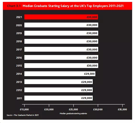 2021年英國領(lǐng)先雇主支付的畢業(yè)生起薪中位數(shù)為30000英鎊,已經(jīng)連續(xù)7年保持不變。